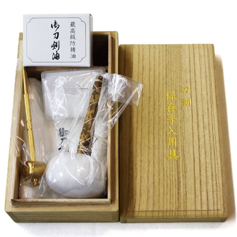Présenté avec une élégante boite traditionnelle en Kiri 桐箱 (bois de Paulownia), ce coffret permet de garder les accessoires à l'abris de l'humidité. C'est un coffret haut de gamme idéal et complet pour l'entretien des lames aciers.