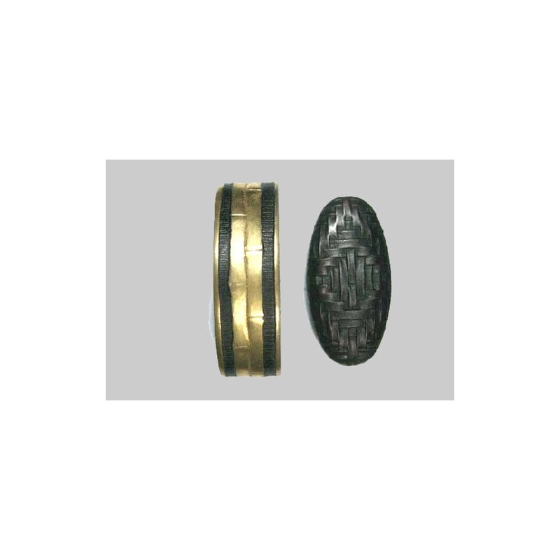 Cet ensemble Fuchi Kashira représente un tressage traditionnel en bambou et des liserés dorés en forme de tige de bambou.