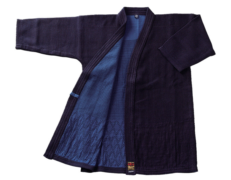 Ce Kendogi Kanmuri Jissen Gata Niju Orizashi double couche est la veste indigo prélavée supérieure épaisse pour le iaido, les Koryu et le Kendo.