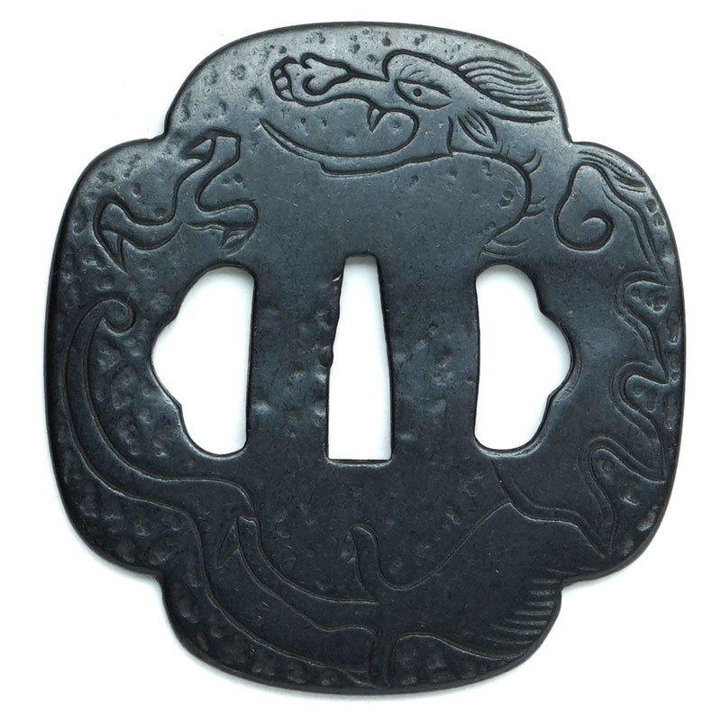 Tsuba : Design de Dragon sous la Pluie (Amaryū - 雨龍), forme quadrilobée (Mokko Gata), en fer noirci.