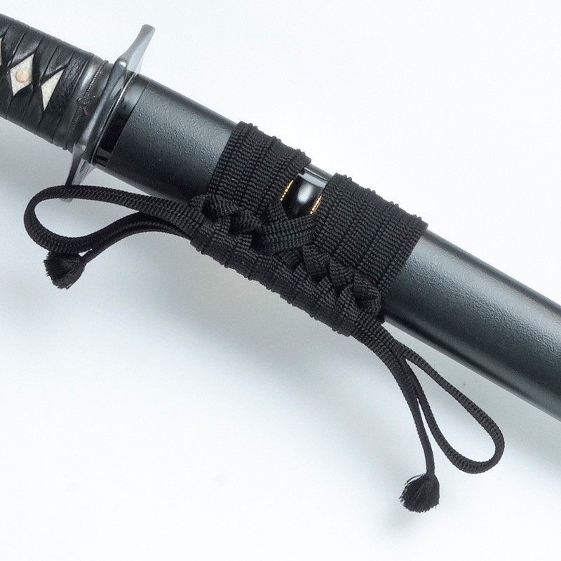 Tsuka Ito : Tressage Katate Hira Maki de la poignée en Cuir de boeuf de couleur Noire, avec Menuki centrés apparents (spécificité de ce montage).
