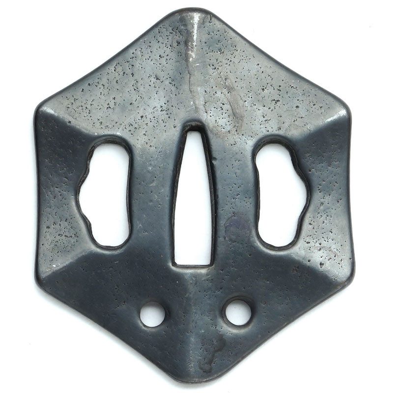 Tsuba : Tsuba Hanjirō (半次郎), de forme hexagonale, en cuivre noirci.