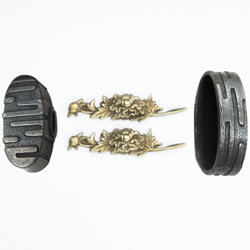 Menuki : Pivoine (Botan - 牡丹) Symbole de bravoure, d'honneur, prospérité et de force, la tige raide lui permettant de rester droite même sous le vent et la pluie. C’est également un symbole de force protectrice. Montage Sakasa (inversés).