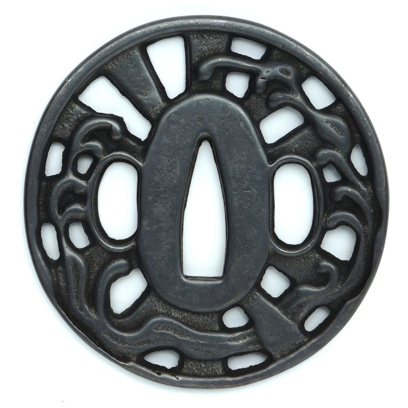 Tsuba : De forme Ronde (Maru Gata) au design de Roue et de Vagues 波車 (Nami Kuruma) en ouvertures (Sukashi)