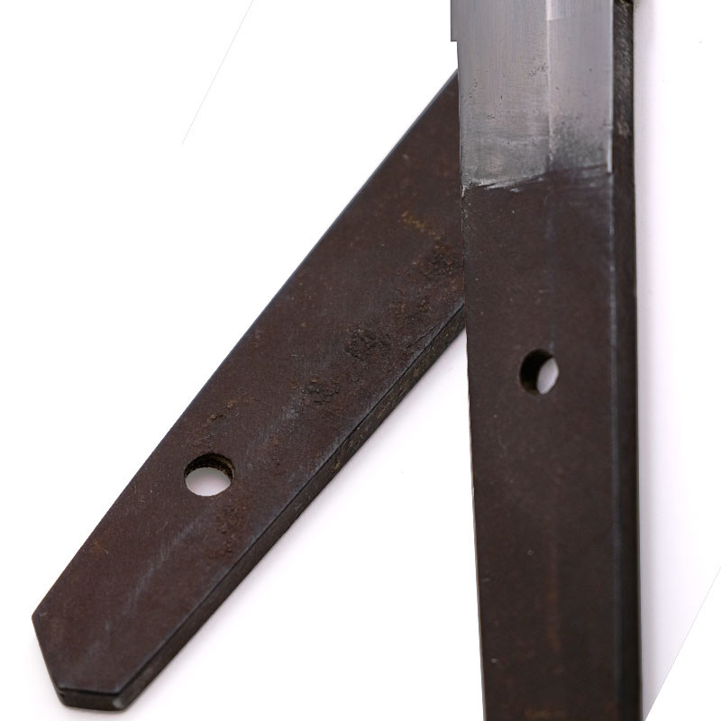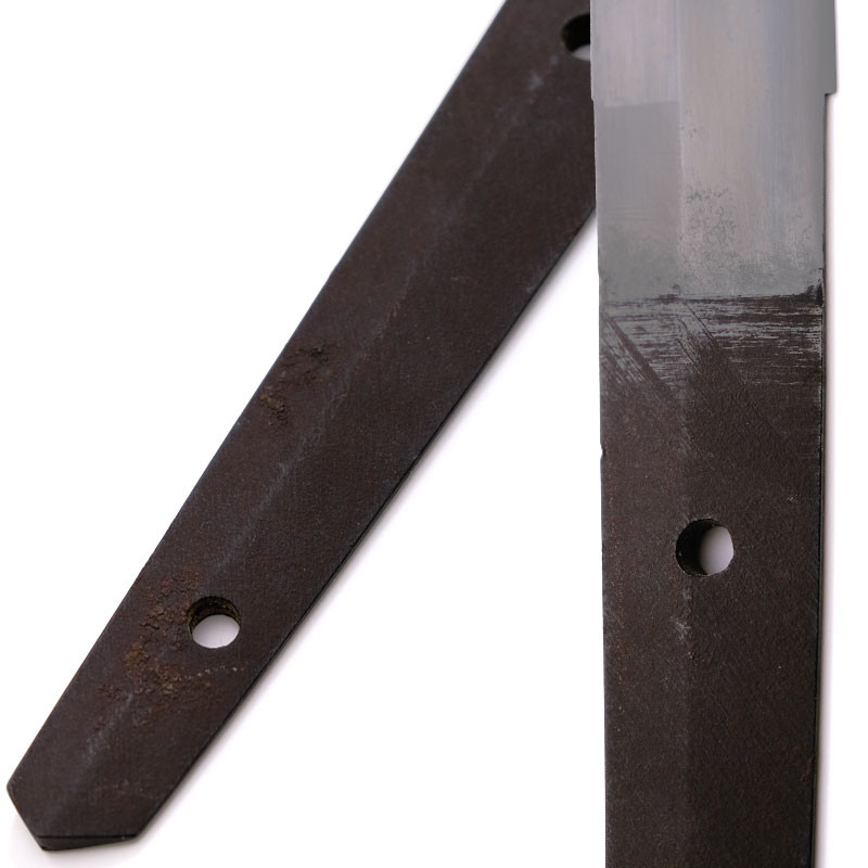 | Nakago | longueur 17.5cm, Mumei (non signé), O suriage (raccourci) refait parfaitement, Futsugata (forme classique), 2 Mekugi Ana, Kesho Yasurime, extrémité Iriyamagata (En V dissymétrique prononcé) | |
