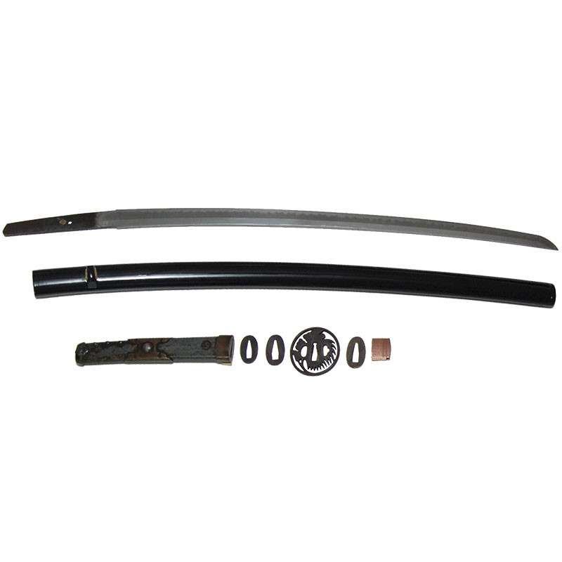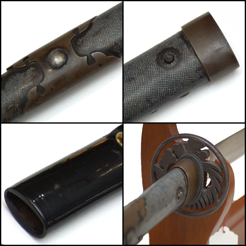 - Tsuka : Poignée de type Tachi très particulière et rare avec montures acier, recouvert de peau de requin teintée et laquée, poids 121g. Tsuka sans tresse, appelée Kazaritachi, pièces métalliques appelées Ashikanagu. Présence d'ergots métalliques (Tawara-byo) pour assurer la prise en main. - Tsuba : acier noir ronde (Maru Gata) avec bordure arrondie (Maru Mimi), motifs Sukashi (ouvert) de feuilles de Paulownia. Poids de 116g, taille 6.95cm x 7.1cm, épaisseur 0.65cm - Habaki : Habaki moderne de type Shonai |