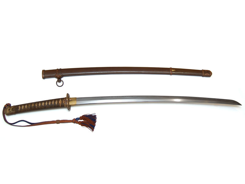 - Tsuka : 182g, 25.5cm (avec Kabutogane), tressage Moro hinerimaki en soie marron, same blanc. - Seppa : Montage Double Seppa numérotées ‘82’.2 seppa crénelées (13g) en cuivre doré, 2 Seppa quadrilobées (18g) avec motif Inome (œil de sanglier). Le motif Inome est aussi appelé Aoi Ha (feuilles de Aoi), il représente des feuilles de Gingembre Asarum, symbole du Clan Tokugawa. - Habaki :25g, en cuivre, avec relief de lignes verticales fines et peu profondes. - Fuchi Kashira :Fuchi numéroté ‘82’ au motif de fleurs et feuilles de Sakura, avec mécanismes de blocage du Saya, bouton poussoir au motif de fleur de sakura. Kashira type Kabutogane avec motifs de feuilles et fleurs de Sakura, avec attache (Hatome) pour la dragonne. - Tsuba :125 g,5.83 cm x 7.01cm x 0.5 cm,numérotée ‘82’, avec 4 motifs de Sakura en relief par face, et relief Seppa-Dai à la forme des Seppa quadrilobées. Rebords en Sukidashi, forme Aoi Gata (quadrilobées avec lobe en forme de feuilles de Gingembre Asarum). - Menuki :2 Menuki cuivre jaune au motif de 3 fleurs de Sakura à 10 pétales. - Dragonne : Dragonne en soie bicolore, Marron et Bleu. Dragonne d’officiers supérieurs, Lieutenants ou Capitaines. |