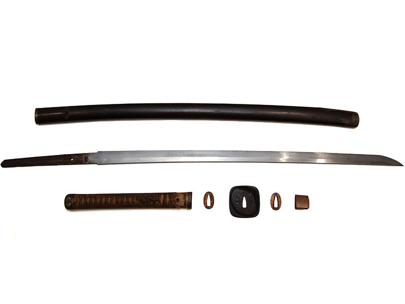 Dans son jus, non rénové, bien que le fourreau et le tressage soient abîmés, la lame est plutôt bien conservée, aucun défaut de forge apparent, laissant apparaître une belle ligne de trempe en gunome. Lame rare et impressionnante par sa longueur (76cm de Nagasa) soulignée par le O Kissaki typique Shinshinto (Bakumatsu) . Bel ensemble de Tosogu (pièces en suite), accompagnée d'une Tsuba Kinai signée. |