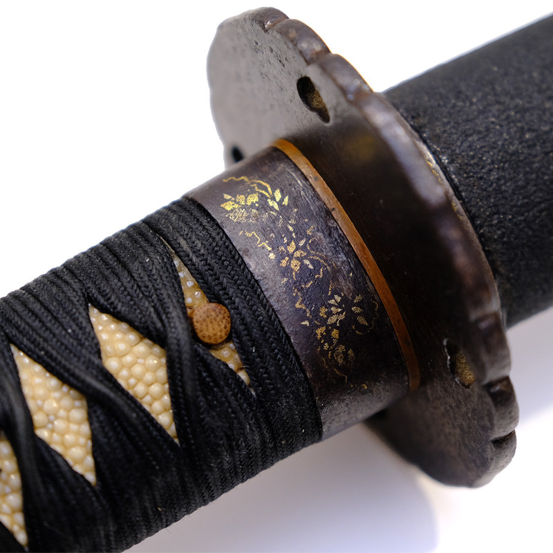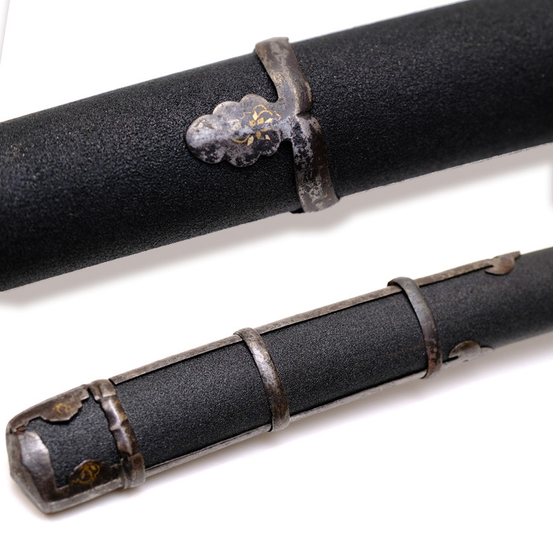 | Saya | Saya Laquée noir mâte (Kuroishime), poids 200g. Laque au charbon, fine et scintillante, Sageo en soie bleue, Kurigata et Koiguchi en corne noire. Montage Handachi complet en acier avec motifs de liserés et pétales de fleurs dorés et argentée sur Amaoi, Fuchi, Kuchigane, Shiba Biki, 3 Seme Gane, et Saya Jiri | |