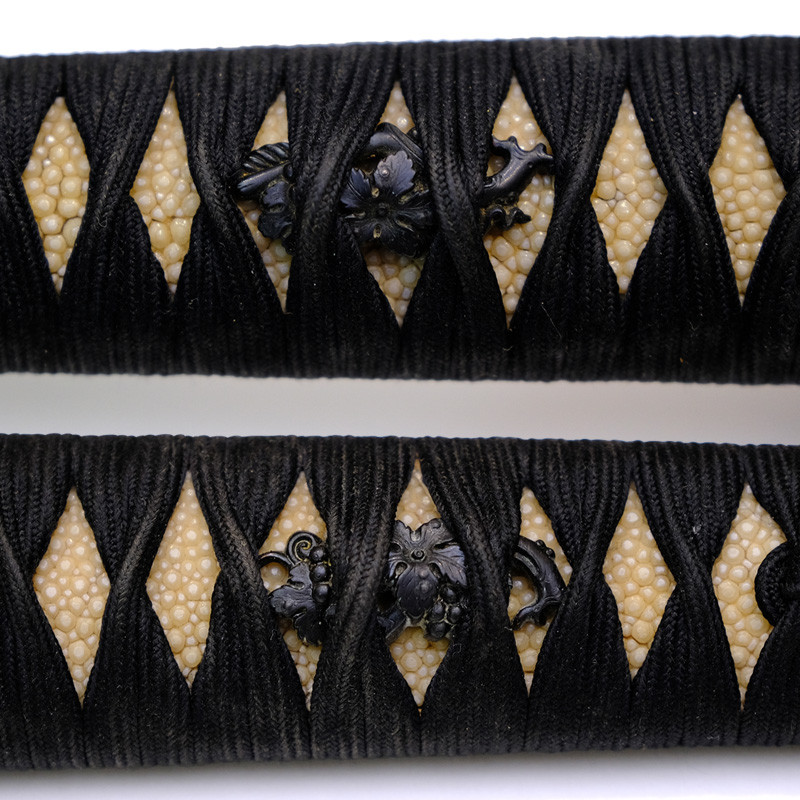 - Tsuka : Poids 96g, longueur 19.50 cm, avec tressage Handachi Zuka maki en soie noire. - Menuki: Menuki en Shakudo au motif de feuilles et grappes de vignes. Same blanc en galuchat de bonne qualité. - Fuchi & Kashira : Kashira (Kabutogane) de l’ensemble Handachi en fer, avec motifs de liserés et pétales de fleurs dorés et argentés. - Tsuba: Poids 116g, dimension 7,12cm x 7,41cm x 0.43cm. Forme Aoi Gata, bordure arrondie type Maru Mimi, Surface Muji (sans relief). 4 ouvertures en forme d’oeil de sanglier (Inome), souvent aussi confondu avec une forme de cœur. Présence Kogatana Ana. - Seppa: 2 Seppa en cuivre simple non crénelées (2x9g) - Habaki: Poids 27g, en cuivre avec motif Kuri jiri léger |