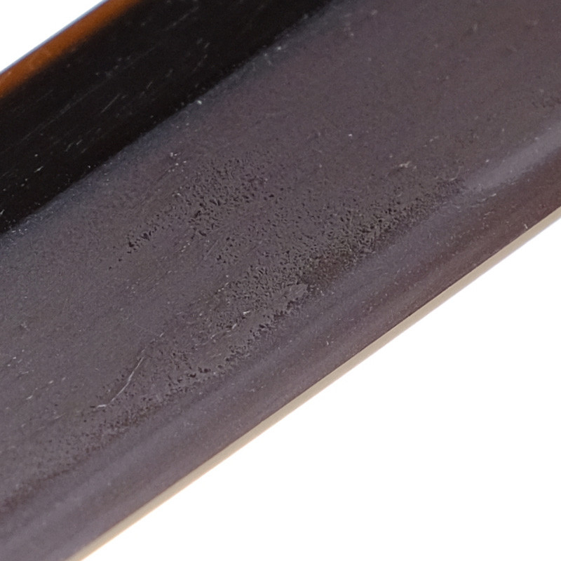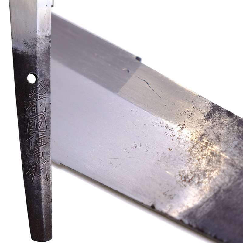| Nakago | Ubu (d'origine), signé 越前國住包則 "Echizen Kuni Ju Kanenori" sur face Omote, 1 Mekugi Ana, Forme Futsu Gata, extrémité en Ha Agari Kuri Jiri,Yasurime Katte Sagari. | |