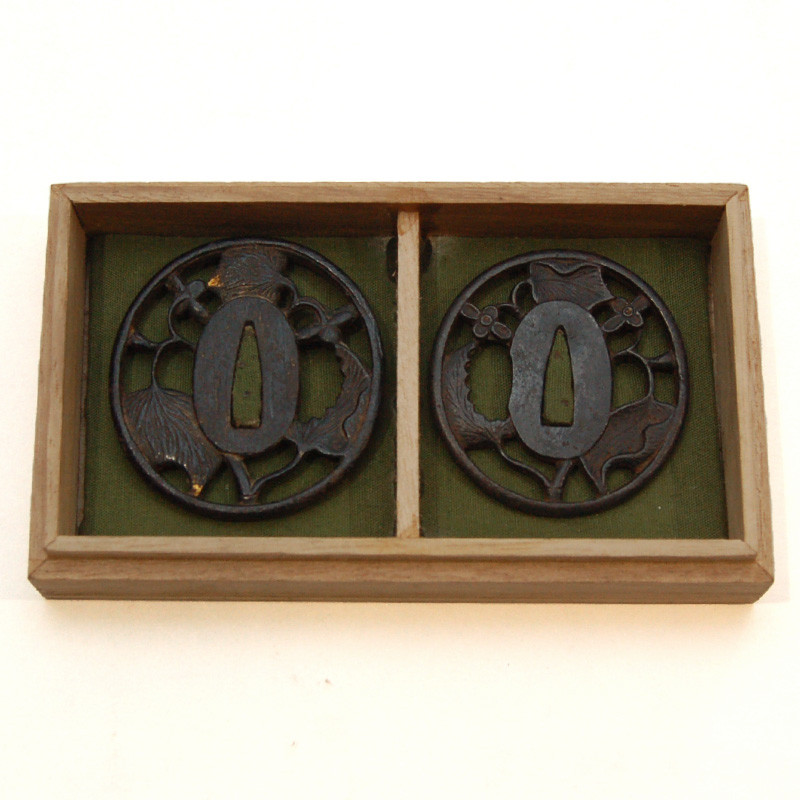| Description | Description : Set de Tsuba pour Wakizashi en Fer, de forme Maru-Gata (ronde), en Niku Bori Sukashi Bori (ajourage partiel), ayant pour décor les Maruni Mitsubaaoi (cercle entourant les 3 feuilles de Aoi (Gingembre asarum), symbole de Tokugawa). Incrustations partielles restantes en or avec la technique Hira Zogan. Particularités : Motif du mon (emblème) du clan Tokugawa (Matsudaira), le aoi Mitsuba (三葉 葵) ou « triple rose trémière ».Souvent associé et traduit par « motif de rose trémière », ce Mon symbolise en fait des feuilles de Gingembre Asarum. Le nom complet « Mitsu Ba Aoi » se compose de trois parties, Mitsu qui signifie 3, Ba qui signifie la feuille et Aoi, le gingembre. La symbolique des trois feuilles représente est aussi lié au « Gosanke Tokugawa », les trois maisons des Tokugawa. Il s’agit des trois branches du clan Tokugawa, les trois fils de Ieyasu Tokugawa, Yoshinao (Province Owari), Yorinobu (Province Kii) et Yorifusa (Province Mito). Ce Mon est devenu facilement reconnaissable,un symbole non seulement du clan, mais de tous les shogunat Tokugawa. Ce Mon est généralement utilisé pour suggérer le moment de l'histoire période Edo. Pendant la période Bakumatsu, il est utilisé pour identifier les personnages fidèles au shogunat, en opposition au mon au motif de chrysanthème est symbole de famille impériale et des loyalistes. |