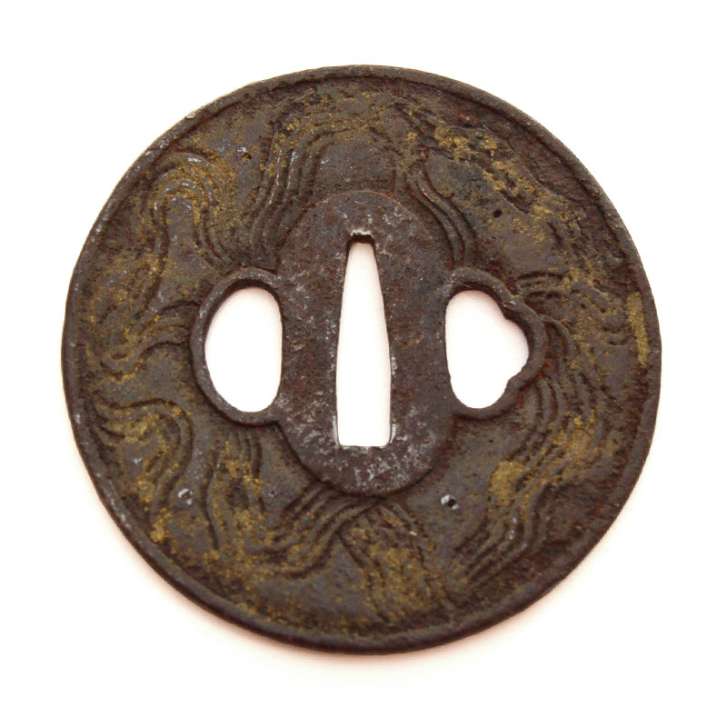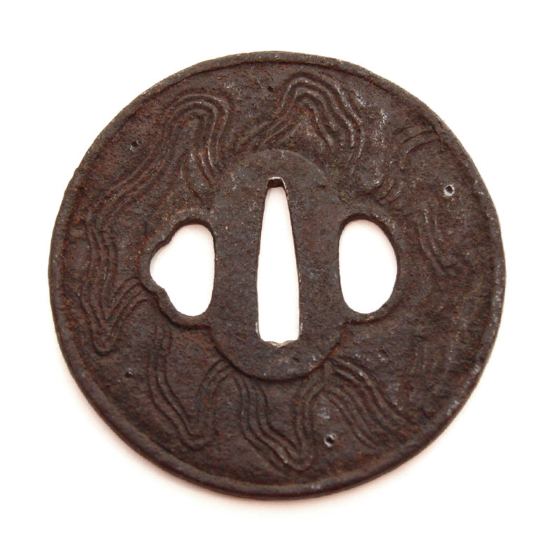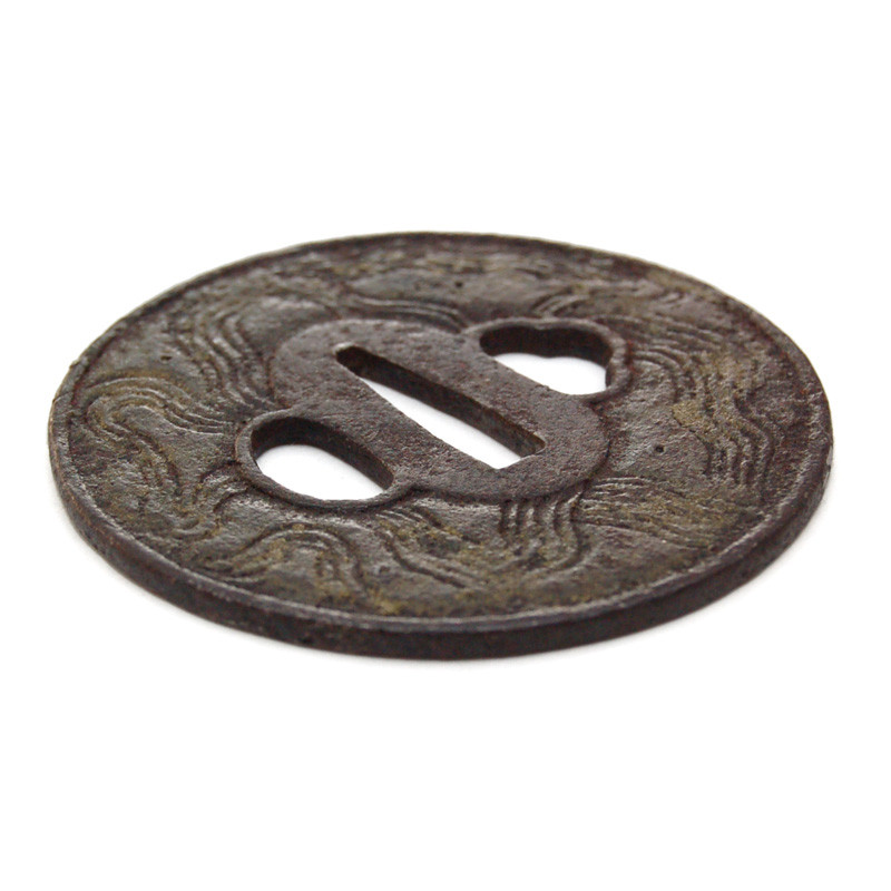 Description : Tsuba en Fer, de forme Maru Gata (de forme ronde) avec un design de vagues sur les 2 faces, avec côté Omote un reste d'incrustation.