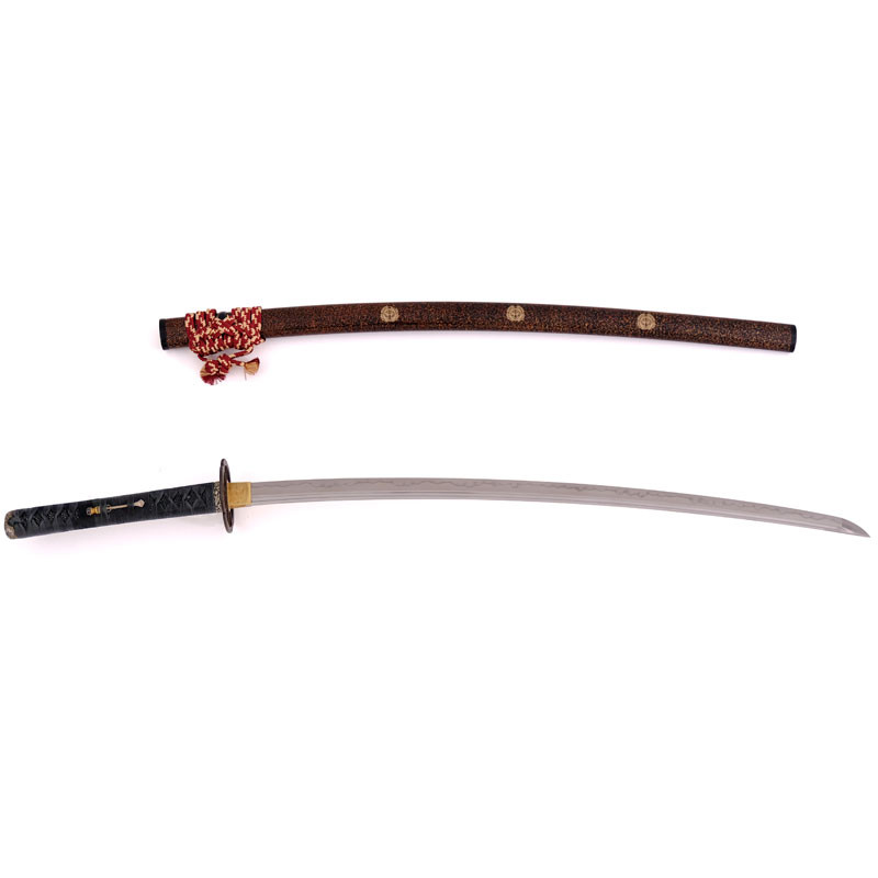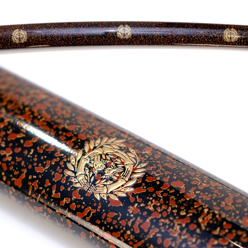 | Saya | Poids 268g, longueur de 80.5 cm, Koiguchi renforcé en corne, Sageo en soie aux couleurs crème et pourpre, Shitodome dorés, magnifique laque Tsugarunuri de type Karanuri (laque d’Aomori développée durant la période Edo). Avec Mon de Masamune Date appelé « Take ni Suzume ». Masamune Date 伊達政宗, grand seigneur de guerre redouté gouvernant dans le Tohoku, était surnommé le Dragon Borgne « Dokugan Ryu » 独眼龍. |