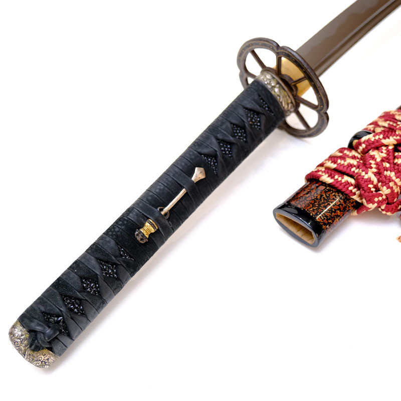 - Tsuka : 147g, 26.3 cm, tressage Katate Maki en Nubuck noir, Same Noir, Mekugi en corne, - Menuki : Sankozuka avec motif de Ken et poignée Vajra (arme et symbole de Fudo Myo) - Tsuba : 88g, largeur 8.78 x h 8.95 x e 0.43cm, forme quadrilobée Mokko Gata avec ouvertures larges Sukashi en forme de 8 rayons, Typique des Tsuba HeianJo de la fin Muromachi, avec liserés et points dorés. - Fuchi et Kashira : Fuchi Kashira argenté au motif de Unryu雲龍 (Dragon dans les nuages), - Habaki : 30g, en cuivre doré, forme type double Habaki avec Nekogaki horizontaux en partie basse. - Seppa : 8g (3 seppa), 2 seppa argentées, 1 seppa cuivrée. |