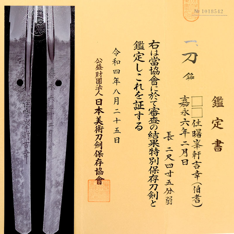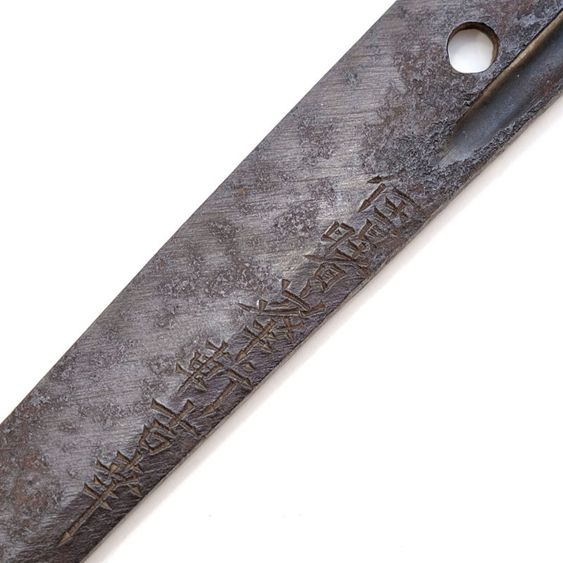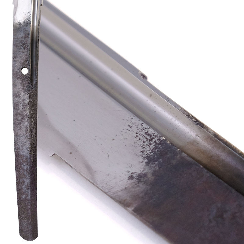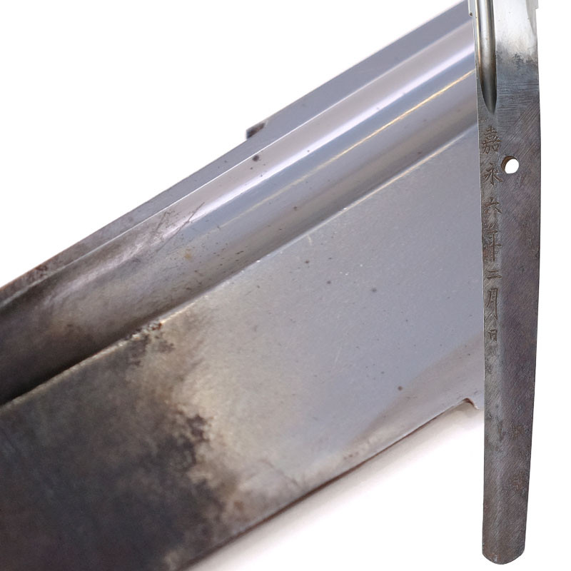 | Nakago | Ubu, signé « 米子住曙峯軒吉幸 » sur face Omote, daté «嘉永六年二月日 » sur face Ura. 1 Mekugi Ana, Kesho Yasurime, forme Futsu Gata, extrémité en Ha Agari Kurijiri (U dissymétrique). | |