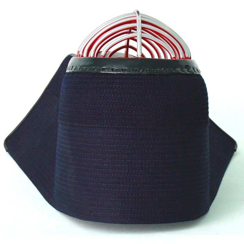 Ce Men 面 (Casque) est composé d'une grille (Mengane) de 14 lignes de renfort horizontal en duraluminium.Le contour du Mengane et les passages des Men Himo sont en cuir synthétique noir.La bavette de protection de gorge (Tsukidare) est rigide, épaisse, et recouverte de cuir synthétique noir surpiqué.L'ensemble du Menbuton est en tissu 100% coton bleu indigo surpiqué en 6mm.