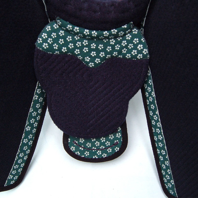 L'ensemble du Menbuton est en tissu 100% coton bleu indigo surpiqué en 5mm, avec coutures haut de gamme en diagonal sur les bavettes latérales (Naname-Zashi Mendare).