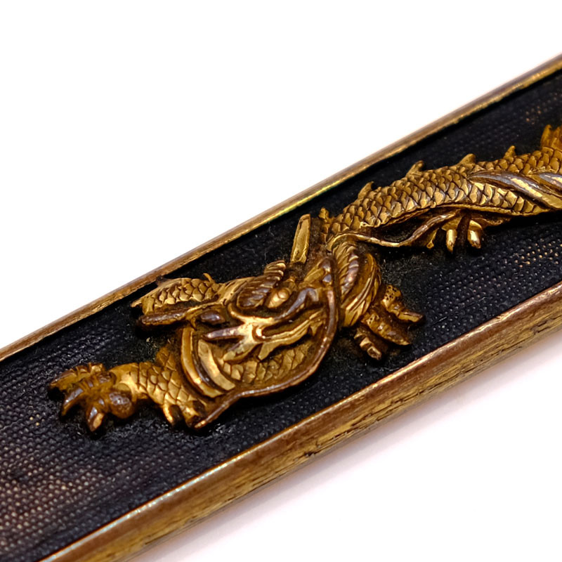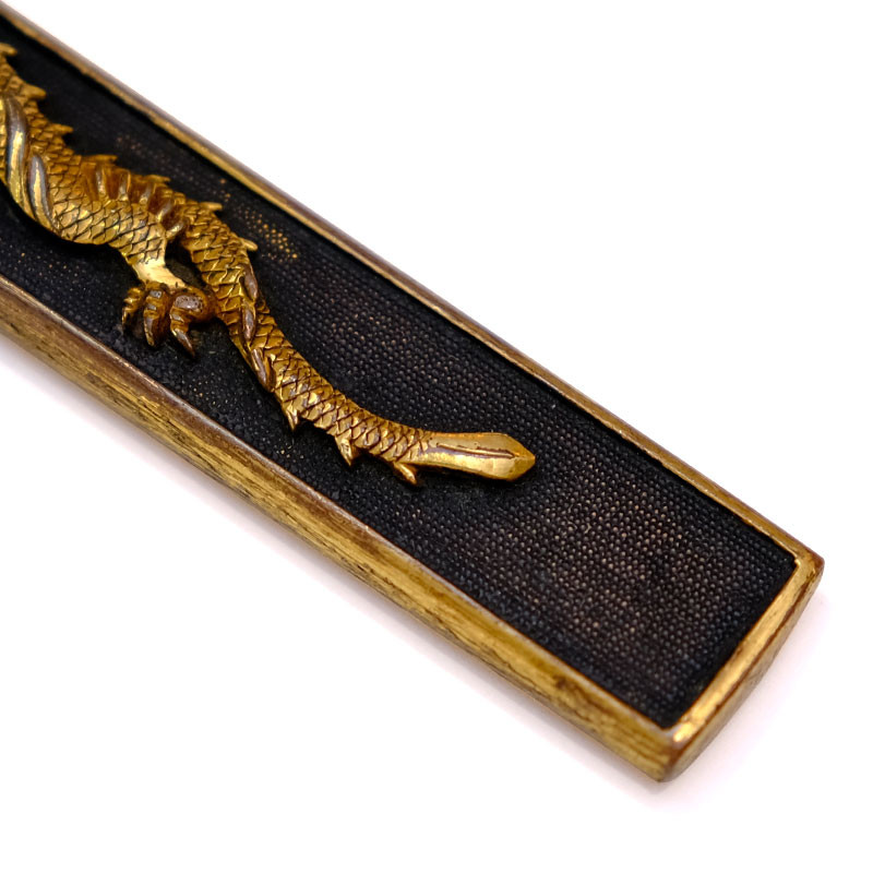 Mumei (non signé), Motif dragon doré en technique Taka zogan, sur fond Nanako (œufs de poisson). Arrière doré avec motif Nekogaki (griffe de chat).
