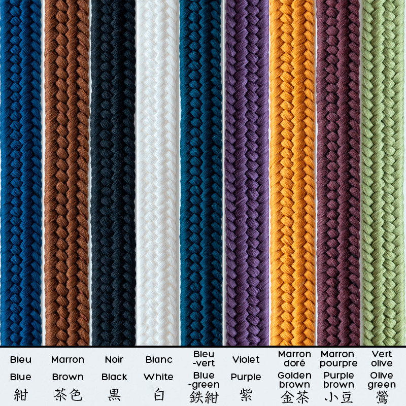 Sageo en soie avec tressage de type "Shigeuchi", en chevrons. Ce tressage a la particularité d'être très agréable au toucher et résistant car plus épais qu'un tressage fin (Kakucho). Il est aussi très apprécié des connaisseurs car sa structure en chevron à un effet auto-bloquant assurant des attaches solides.