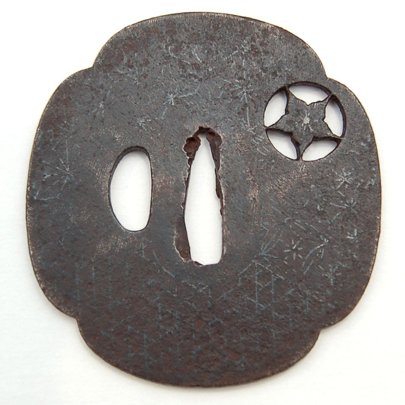 Description : Tsuba en Fer, de forme Mokko Gata (de forme quadrilobée) avec un design d'hexagones entrecroisés représentant la feuille de lin (Asanoha) avec la technique Hira Zogan.